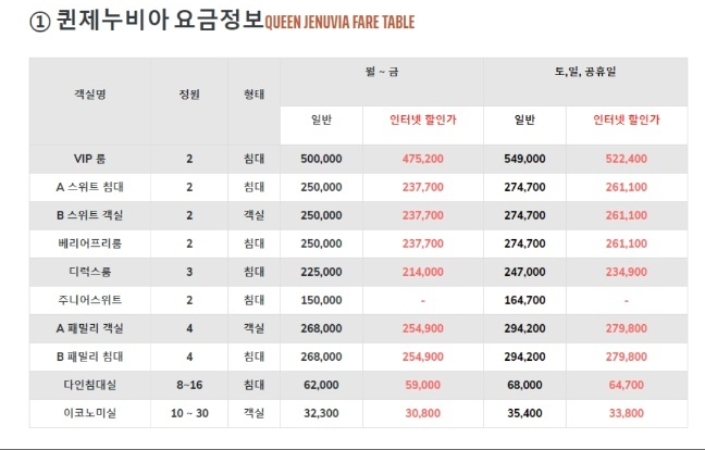 퀸제누비아 크루즈는 목포항과 제주항을 정기적으로 운항하고 있습니다. 2025년 현재 스위트룸은 25만원대, 일반실은 15만원대로 운영되고 있으며, 인터넷 예약 시 최대 10%의 할인 혜택을 받으실 수 있습니다. 성수기인 7-8월과 연말연시에는 별도의 할증 요금이 적용되니 참고하시기 바랍니다.